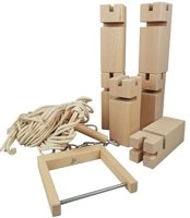 Goki. Fröbelturm [Gra] - Germany : Güster, [2024]. - 1 gra (1 pałąk z metalowym drążkiem, 6 klocków, 1 krążek z 8 otworami i 16 sznurkami po 2m długości każdy) : drewno bukowe, sznur ; w worku 35x47cm +Instrukcja.