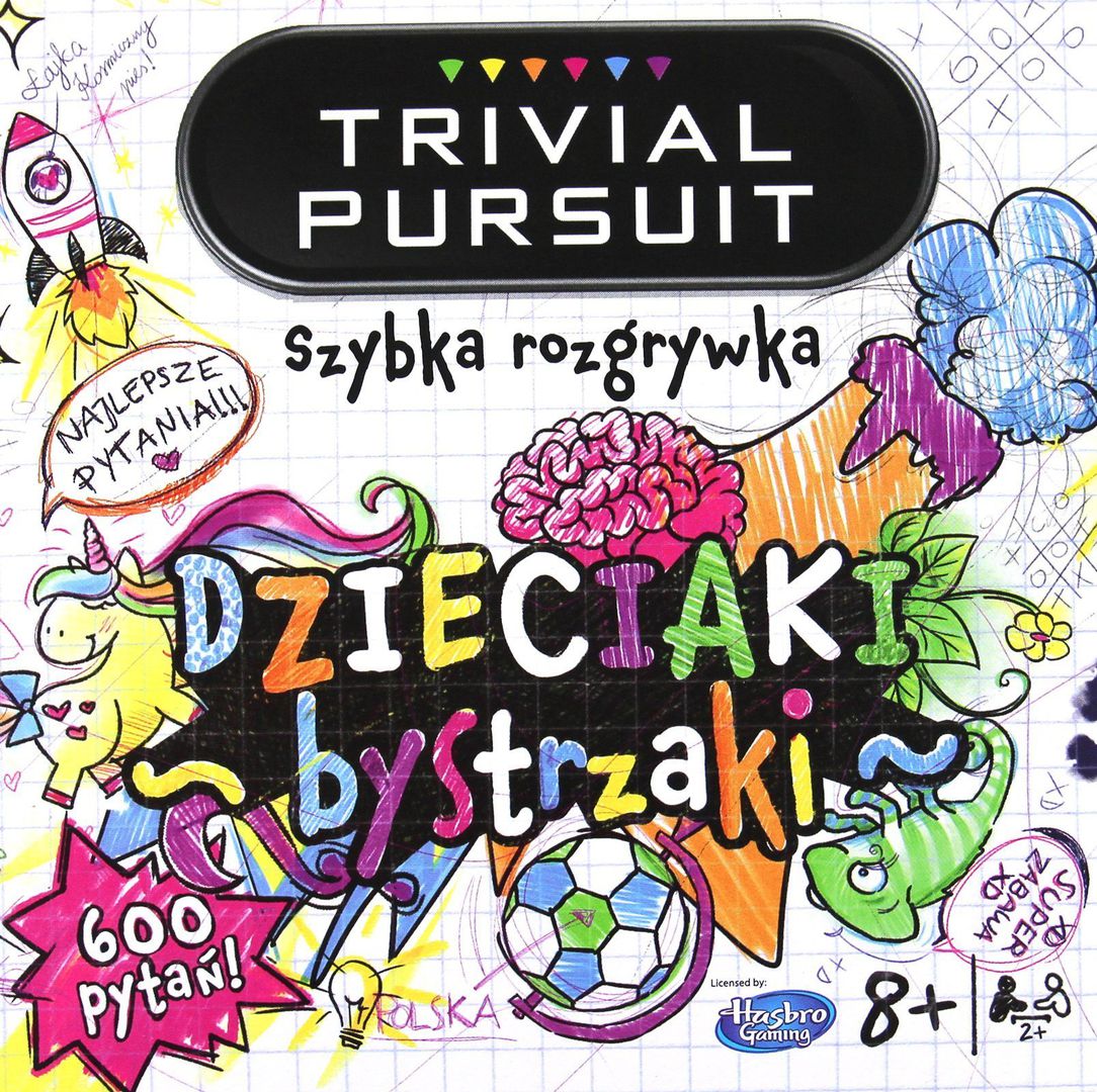 TRIVIAL PURSUIT Dzieciaki bystrzaki to najlepszy sposób na dobrą zabawę! Odliczasz sekundy do dzwonka, bo świat bywa ciekawszy niż lekcje? Kochasz bawić się na całego? Sięgnij po TRIVIAL PURSUIT Dzieciaki bystrzaki, by zabłysnąć wśród kolegów i koleżanek wiedzą, która zwali ich z nóg. Nieważne ile masz lat, już teraz możesz się uczyć bawiąc i bawić, ucząc! Wśród 600 pytań na 100 kartach odkryjesz niezwykłe, a czasem może nawet obrzydliwe fakty! Otwórz się na niesamowite królestwo zwierząt, poznaj wynalazki, które zmieniły świat i dowiedz się, dlaczego człowiek ma brwi! Uwaga, to nie jest quiz dla nudziarzy – zbierz swoją paczkę i sprawdźcie kto jest najlepszy! To specjalne wydanie gry nie wymaga planszy, dzięki czemu zawsze możesz wziąć ją ze sobą tam, gdzie czekają na dobrą zabawę...[nota wydawcy]