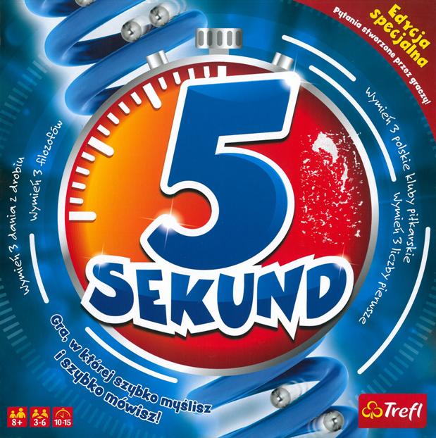5 sekund [Gra] / [autorzy pytań Adam Kulik i inni ; opracowanie graficzne Sebastian Goyke]. - Gdynia : Trefl, copyright 2019. - 1 pudełko (362 karty z pytaniami (724 pytania), 6 kart "Następny", 6 kart "Zmiana", 6 pionków do gry, plansza do gry, 1 specjalny czasomierz, 1 pudełko na karty,) ; 26x26x8 cm + instrukcja.