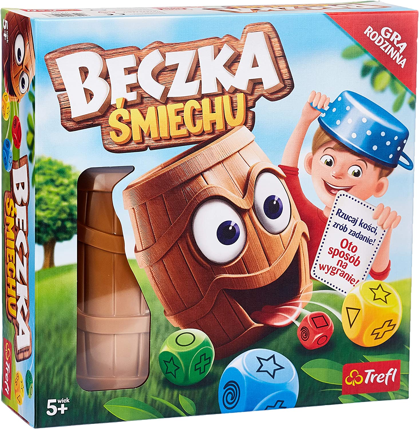 Beczka śmiechu : gra rodzinna [Gra] / autor gry: Mariusz Majchrowski ; opracowanie graficzne: Monika Duc, Kamila Mrożek, Lemon Tree. - Gdynia : Trefl SA, [2017]. - 1 pudełko : karton, tektura, plastyk ; wymiary pudełka 26x26cm. + instrukcja. Zawartość pudełka: 1 beczka, 8 kości, 53 karty zadań, 3 karty podium.